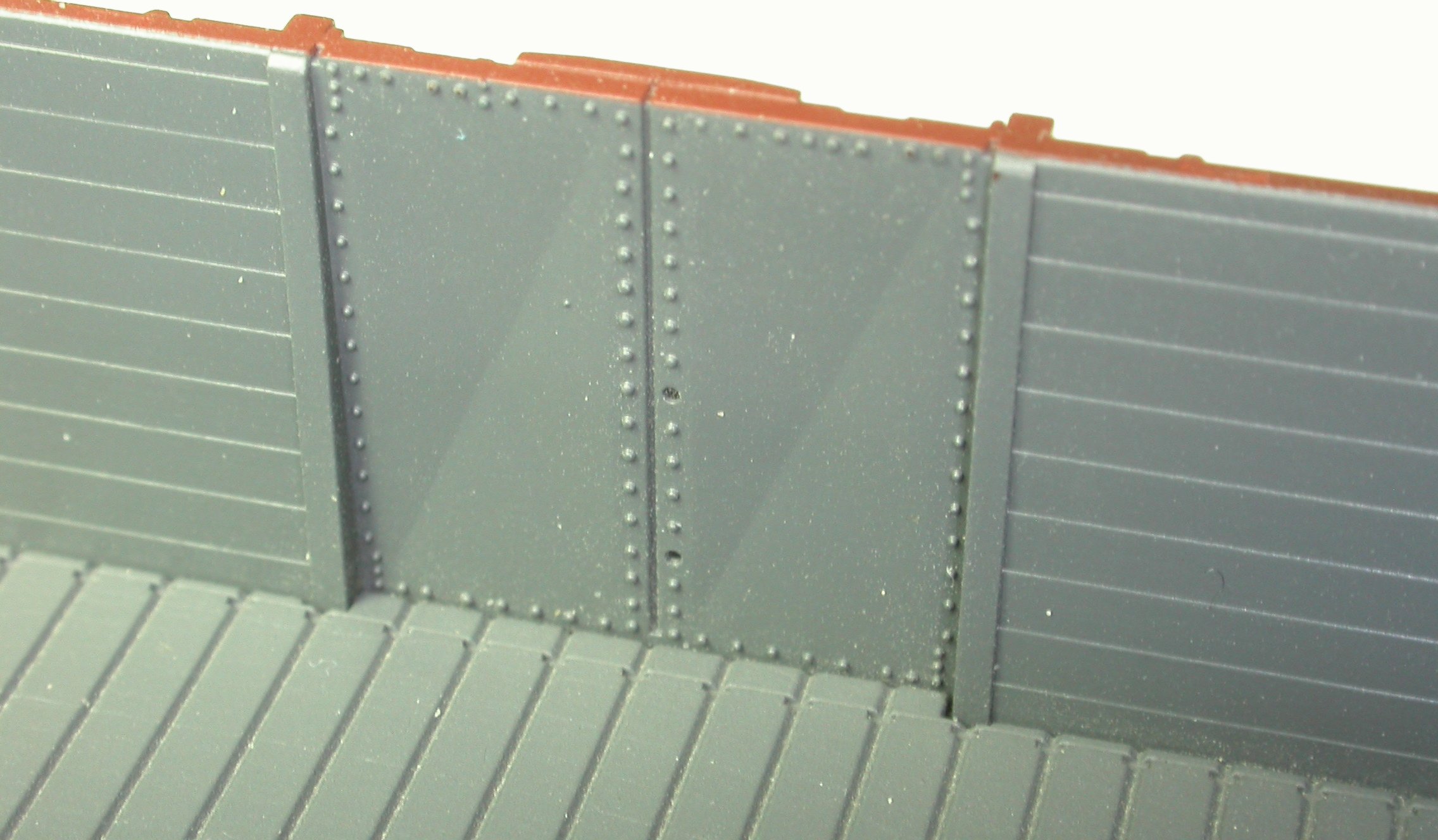 Was aber wirklich sensationell ist, ist die Gravur der Wageninnenseite. Bretterfugen dort hat man ja schon bei einigen Modellen gesehen, auch die Imitation der Fußbodenbohlen-Befestigungsschrauben ist glaubich keine Weltneuheit. Gebuckelte Türen sind indes schon seltener, und die Nieten an der Türinnenseite sind dann endgültig Anlaß für ein beeindrucktes "Booooaaah" oder drei. Wahnsinn! Brawa, Ihr seid Schuld, daß mir meine ganzen anderen O-Wagen von innen nicht mehr gefallen. ;-)