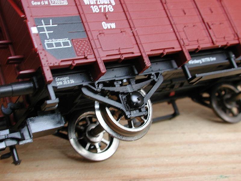 Besonders hervorzuheben, ebenfalls wie gewohnt, sind die hervorragend gelungenen Achshalter, hier vorbildentsprechend in Fachwerkbauweise und mit (beim Vorbild) später nachgerüsteten Achslagern der Verbandsbauart. Genau so hat das auszusehen für ein Modell der Epoche 2, bravo! Die Achslager sahen bei Ablieferung indes deutlich anders aus, was bei allfälligen Epoche-1-Versionen zum Problem werden könnte. Aber die werden, da Sonderserie, ja trotzdem gekauft ;-)