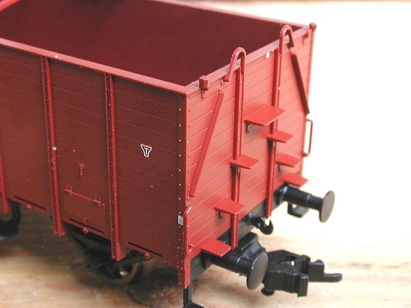 Noch schlimmer indes sieht die Innenseite des gleichen Wagens mit Bremserhaus aus (den ich deswegen auch nicht gekauft habe, daher keine Bilder, sorry). Das Bremserhaus sitzt beim Würzburg, genau wie bei G-Wagen aus jener Zeit, oben halb über der Wagenkastenoberkante und überragt die Stirnwand nach innen. Und was finden wir im Modell darunter? Rastnasen, mit denen das Bremserhaus durch Öffnungen in der Stirnwand eingeklipst ist! Das hätte man umgekehrt auch unsichtbar hinbekommen können, aber dann hätte man ja nicht das Teil vom G-Wagen unverändert übernehmen können. Schon klar.