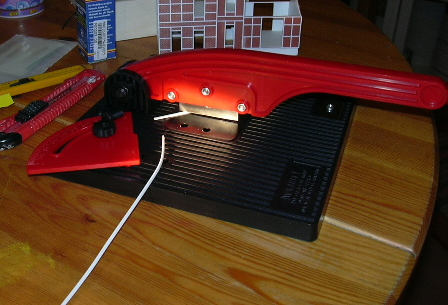 Laut Fohrmann-Homepage und Packungsaufschrift eignet sich das Gerät für Balsaholz und feine Kunststoffprofile, doch auch etwas massivere H-Profile aus PS lassen sich sauber und winklig trennen. Ich war ja doch etwas skeptisch ob der Vollplastikausführung des Schneiders, bisher wackelt aber noch nichts, die Schnitte sind nach wie vor sehr genau.