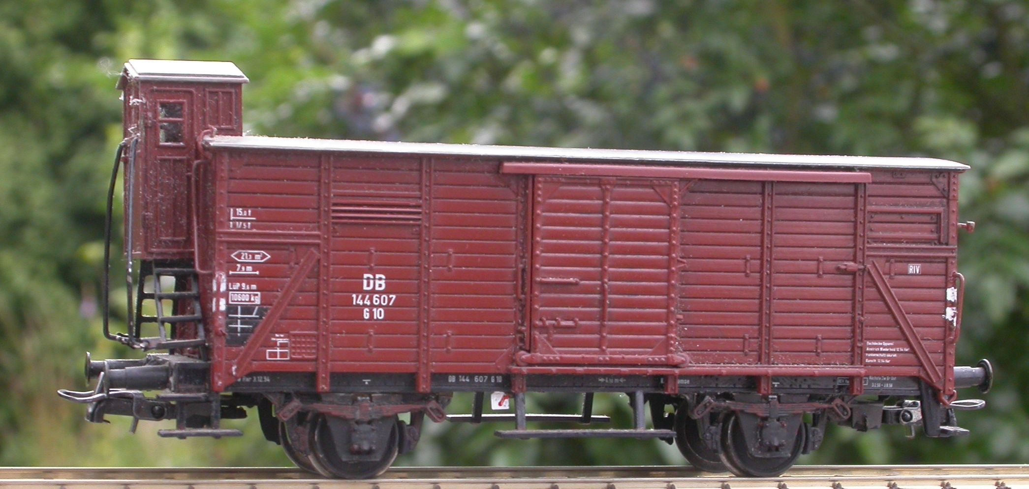 Ob man das Bremserhaus in ein gekürztes umfrokeln mag, ist Geschmackssache; meine durften bei den bisherigen Wagen so bleiben, nur die Fenster habe ich mit Humbrol-Clearfix verglast. Die Bremserhausaufstiege habe ich beim Wagen auf Bild 4 durch ein GFN-Teil ersetzt, allerdings eher weil es gerade herumlag als weil das Märklin-Teil so furchtbar wäre (der Wagen in Bild 6 hat noch die Märklin-Aufstiege). Natürlich kann man das Bremserhaus auch komplett durch ein anderes ersetzen, so richtig schön ist es eh nicht -- Bild 5 zeigt einen Märklin-G 10 mit Roco-Fahrwerk und Brawa-Bremserhaus, eine Kombination, die aber eher bastelkistenlogistikbedingt entstand: natürlich wäre es Unsinn, einen Brawa- und einen Roco-Wagen zu schlachten, um damit einen Märklin-Wagen zu supern :-)