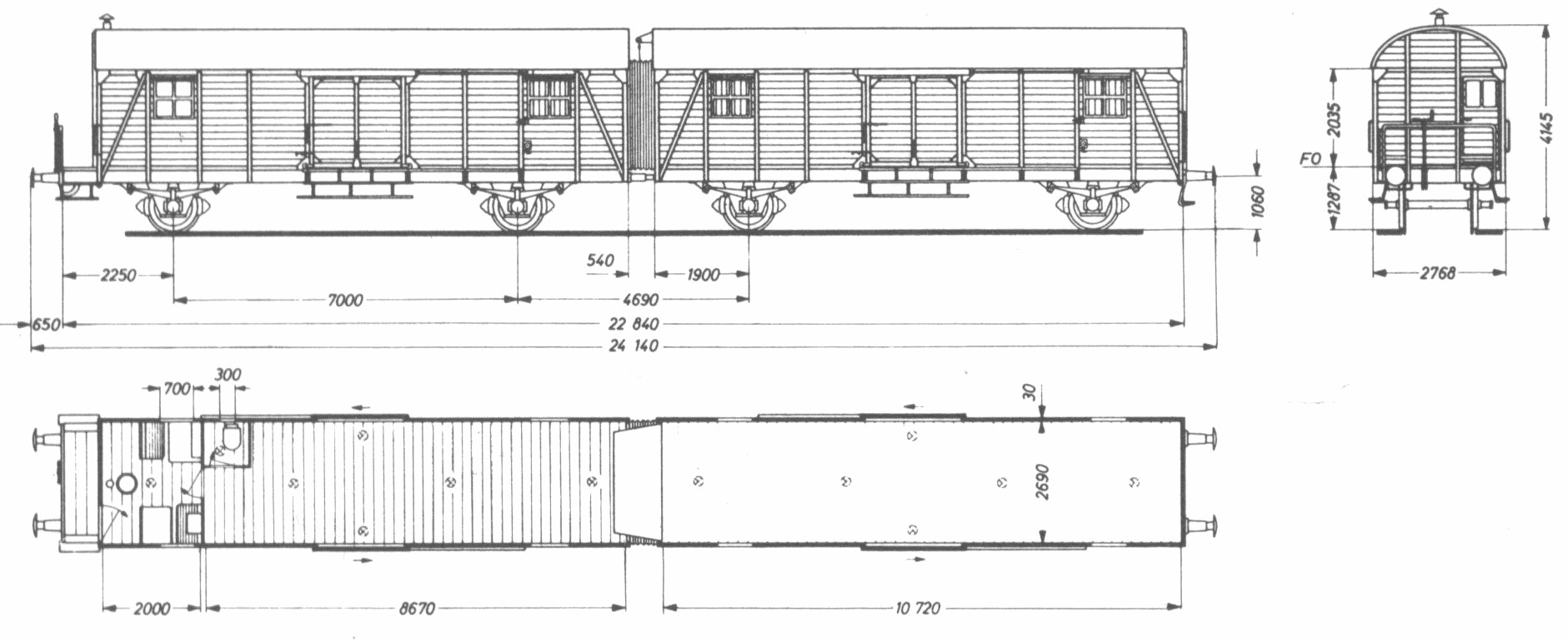 Man erkennt außer dem wiederum anderen Grundriß mit der Toilette an der von der Bremserbühne her gesehen linken Seitenwand vor allem die ungewöhnliche Anordnung der bühnenseitigen Tür: sie ist nicht mittig, also hinter dem ehemaligen Bremserhaus, sondern rechts! Außerdem sind in der Zeichnung auch keine Lüftungsöffnungen mehr eingezeichnet. Ich nehme an, man wird den Wagen mal neu verbrettert und die für einen Leigwagen ja ansich auch unnötigen Öffnungen dabei eingespart haben.