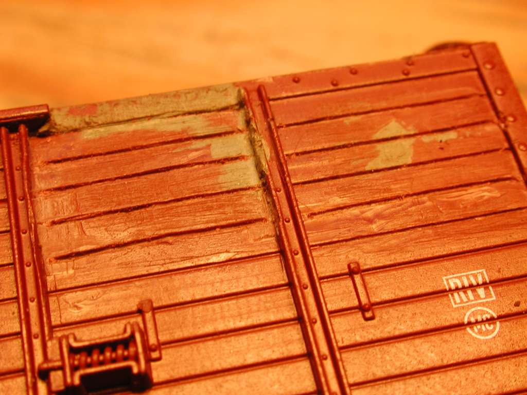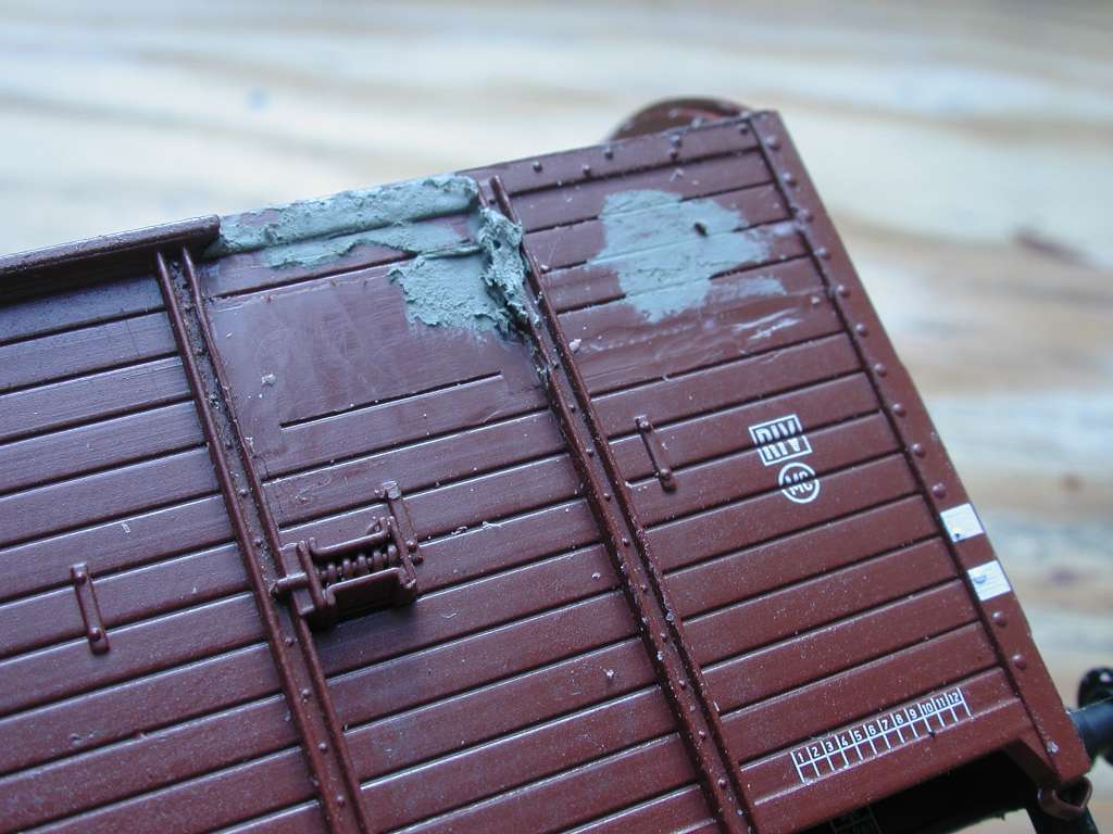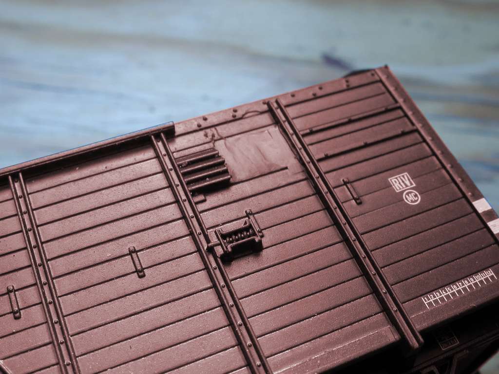 Zum Bretterfugenritzen habe ich mir eine alte, stumpfe Skalpellklinge noch stumpfer geschliffen. Abwechselnd damit ritzen (die ersten paar Durchgänge am Lineal, wenn noch keine Fuge da ist) und mit einer scharfen rechtwinkligen Klinge das hochgedrückte Material locker abschaben. Und wie Bild 12 zeigt, wird auch diesmal nicht alles perfekt. Aber gut genug, um am fertigen Wagen nicht aufzufallen - wetten?
