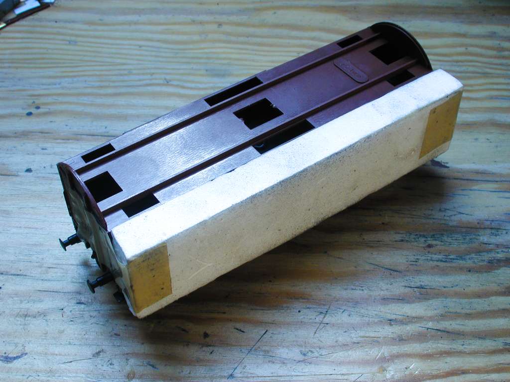 Bis dahin gibt's aber gottseidank die Spachtelmasse für sowas. Bild 10 zeigt im Gegensatz zu Bild 9 meinen ersten Wagen, bei dem mir der Fräser erheblich öfter entglitten ist, nach dem Auftragen von (reichlich ;-) "Presto Finish". Das Pampf gibt's im Autozubehör; es ist billiger als Revell Plasto, haftet besser, stinkt weniger bestialisch und läßt sich hervorragend bearbeiten.