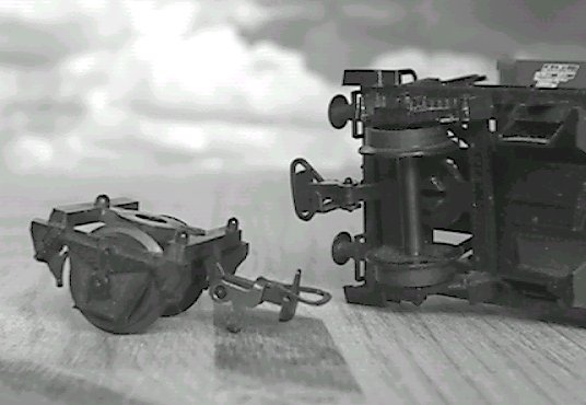 Den Kleinbahn-Wagen zerlegen wir folgendermaßen: zunächst werden die "Einachsdrehgestelle" abgezogen und entsorgt. Es kommen auf der Unterseite vier braune Laschen innen am Langträger zum Vorschein, die Teil des Wagenkastens sind durch das Untergestell gesteckt und verklebt. Ich habe diese Laschen mit dem Cutter teils weggeschnitten, teils weggehebelt. Dann läßt sich der Wagenkasten mit etwas Gewalt vom Fahrgestell lösen. Vorher sollte man aber die angesetzten Teile aus ihren Paßlöchern ziehen, damit's beim Wagenkasten-Abnehmen keinen Bruch gibt: beide Leitern oben am Wagenkasten, die Bedienungshebel am Bühnenende an der Konsole unter dem Hebel und die beiden Griffstangen am anderen Ende am Wagenkasten. Die Teile sind aber verblüffend robust, also keine Bange!