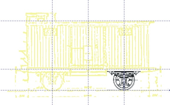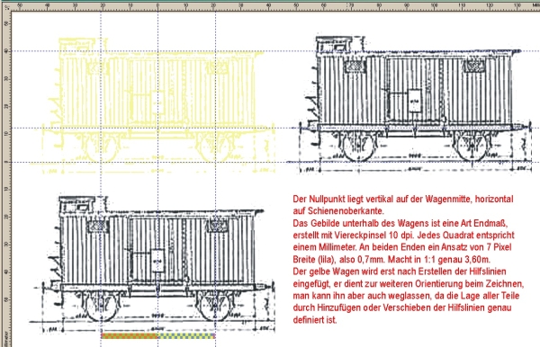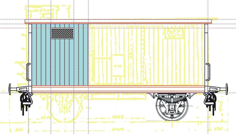 Ähnliches geschieht mit anderen Bauteilen, die für den Wagen passen (Bild 06). Der Rest muß dann eben neu gezeichnet werden, beispielsweise die (blaue) Bretterwand. Von einem Gh03 hole ich mir die Luke, und siehe da, die passt wie angegossen. Da die Seitenansicht symmetrisch ist, reicht das Zeichnen einer Hälfte. Der Bretterwandteil samt Fenster wird in die Zwischenablage kopiert, vertikal gewendet und in die rechte Wagenseite eingefügt. Bauteile, die sich berühren, sind in unterschiedlichen Farben gehalten, so kann man im Falle eines Fehlers diese Teile schnell markieren und weglöschen.