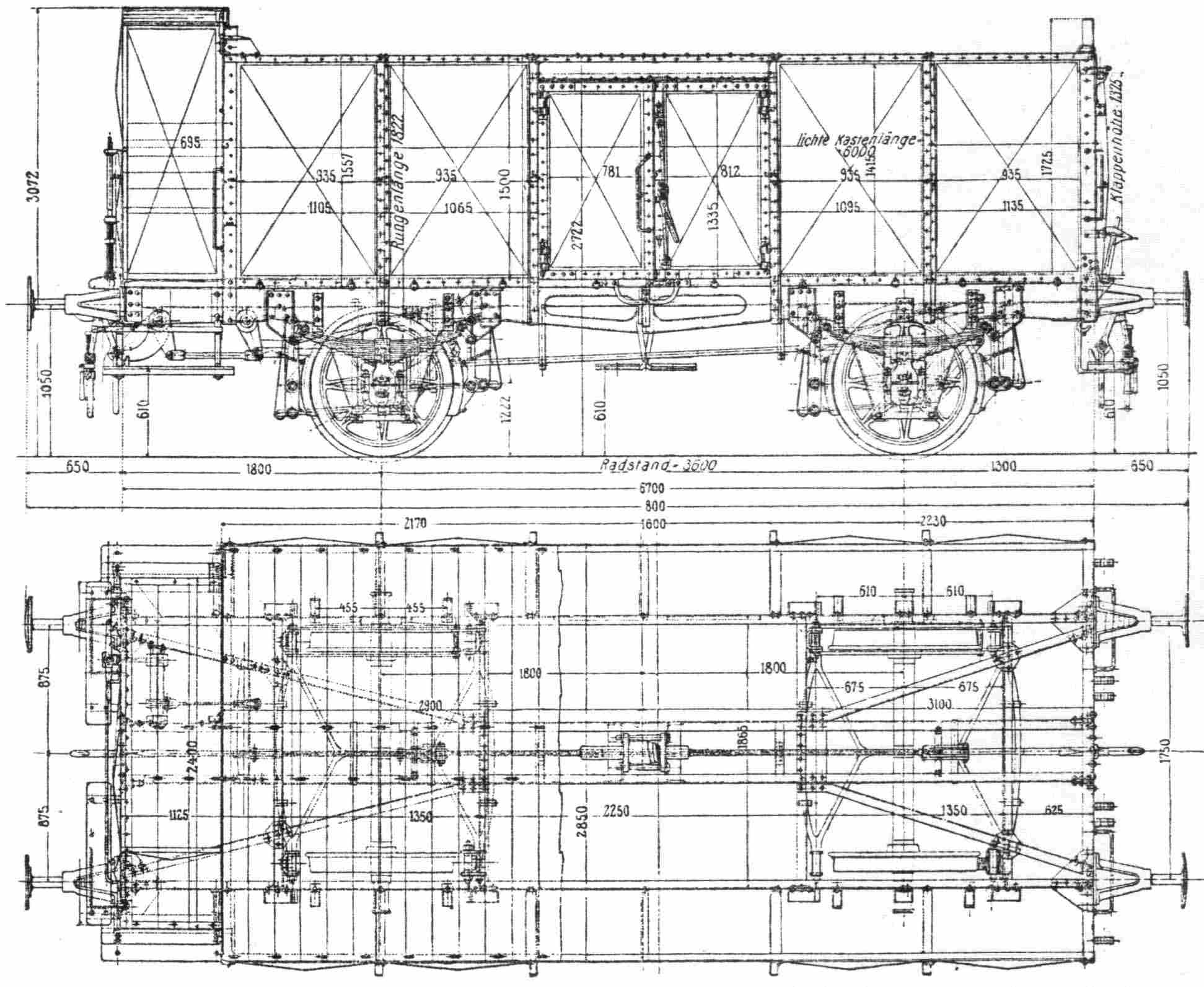 Das Bild zeigt einen O-Wagen mit Blechaufbau der Preußischen Staatsbahnen, ähnlich dem O "Schwerin" der Reichsbahn, nur länger und mit Blechrahmen.
